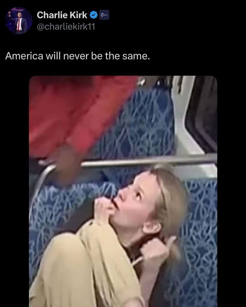 Kirk shared a picture of Iryna Zarutska, a 23-year-old Ukrainian refugee who suffered a fatal stabbing on a Charlotte light rail train, and added the caption, “America will never be the same.” This post has since gone viral.