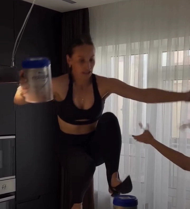 Alright, get this Marina Barutkina from Russia just said, “You know what? Let’s crank this up a notch.” So, she goes and plants one foot just one on top of a baby formula jar (which, by the way, is sitting on a cooking pan), all of it perched on her kitchen counter. Meanwhile, she’s clutching a giant can of food in one hand and just casually rocking a pair of stilettos like it’s no big deal. I mean, come on, who even thinks of this stuff? Total legend move.